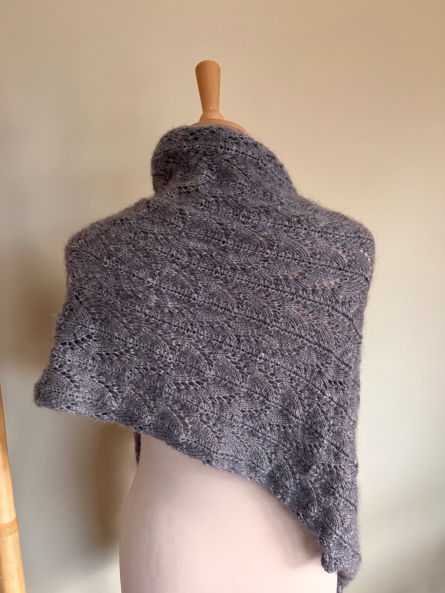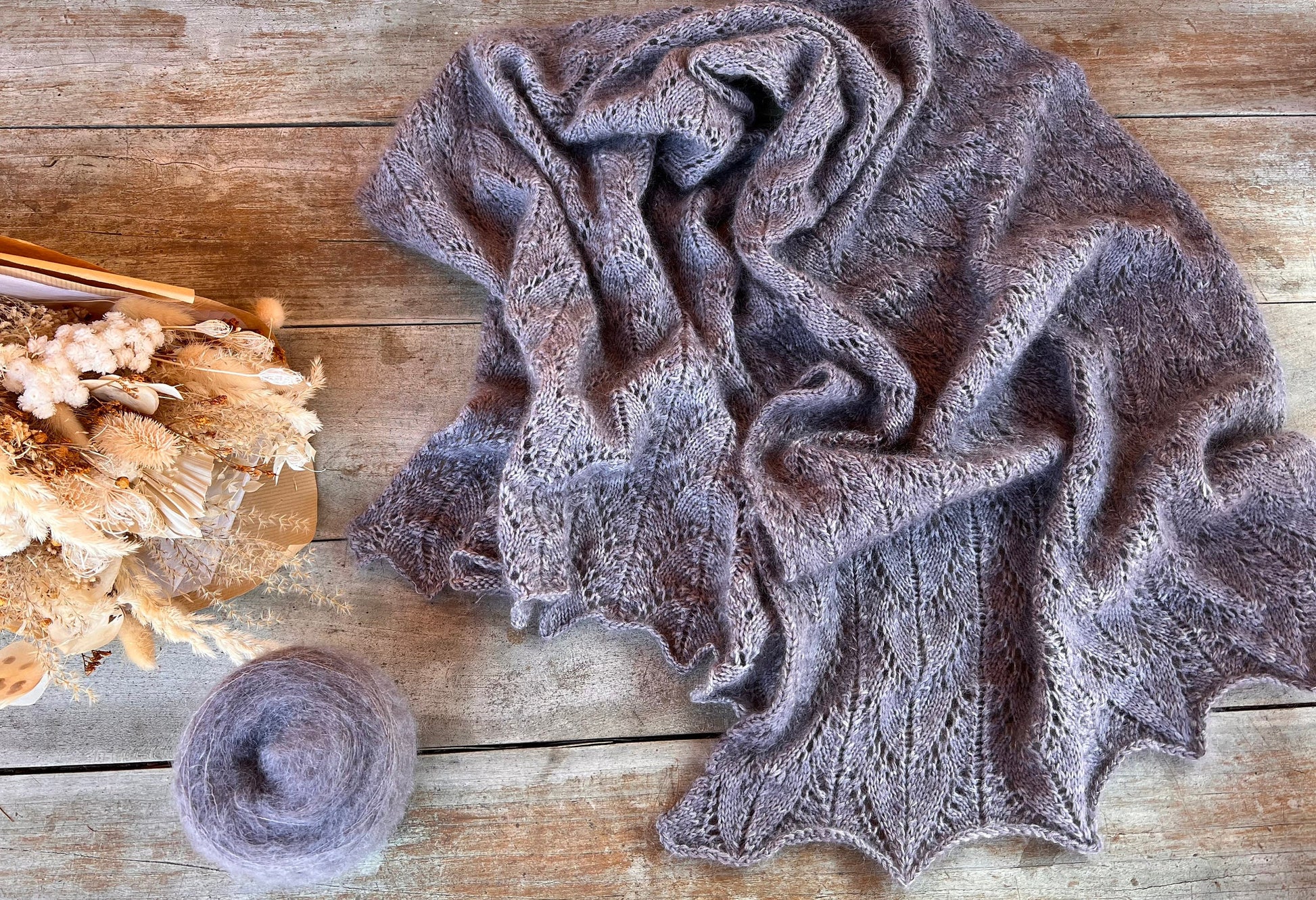 Les explications vous guideront dans la réalisation de ce superbe châle de dimensions 50 x 175 cm. Créé avec les fils Lace mérinos nylon (75/25%, 100 g = 600m) et Mohair et soie (72/28%, 50 g = 420 m) des Laines d'Ursula, couleur Mouse. D'autres choix de laine peuvent être utilisés pour obtenir un échantillon de 10 X 10 cm avec environ 20 mailles sur 32 rangs, en utilisant des aiguilles n°3.5.