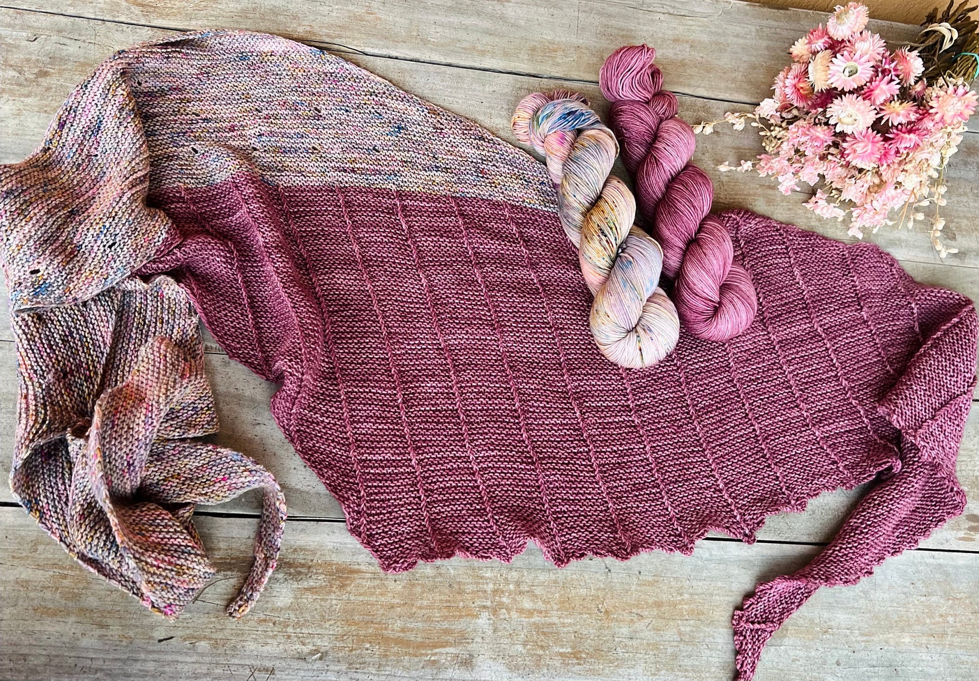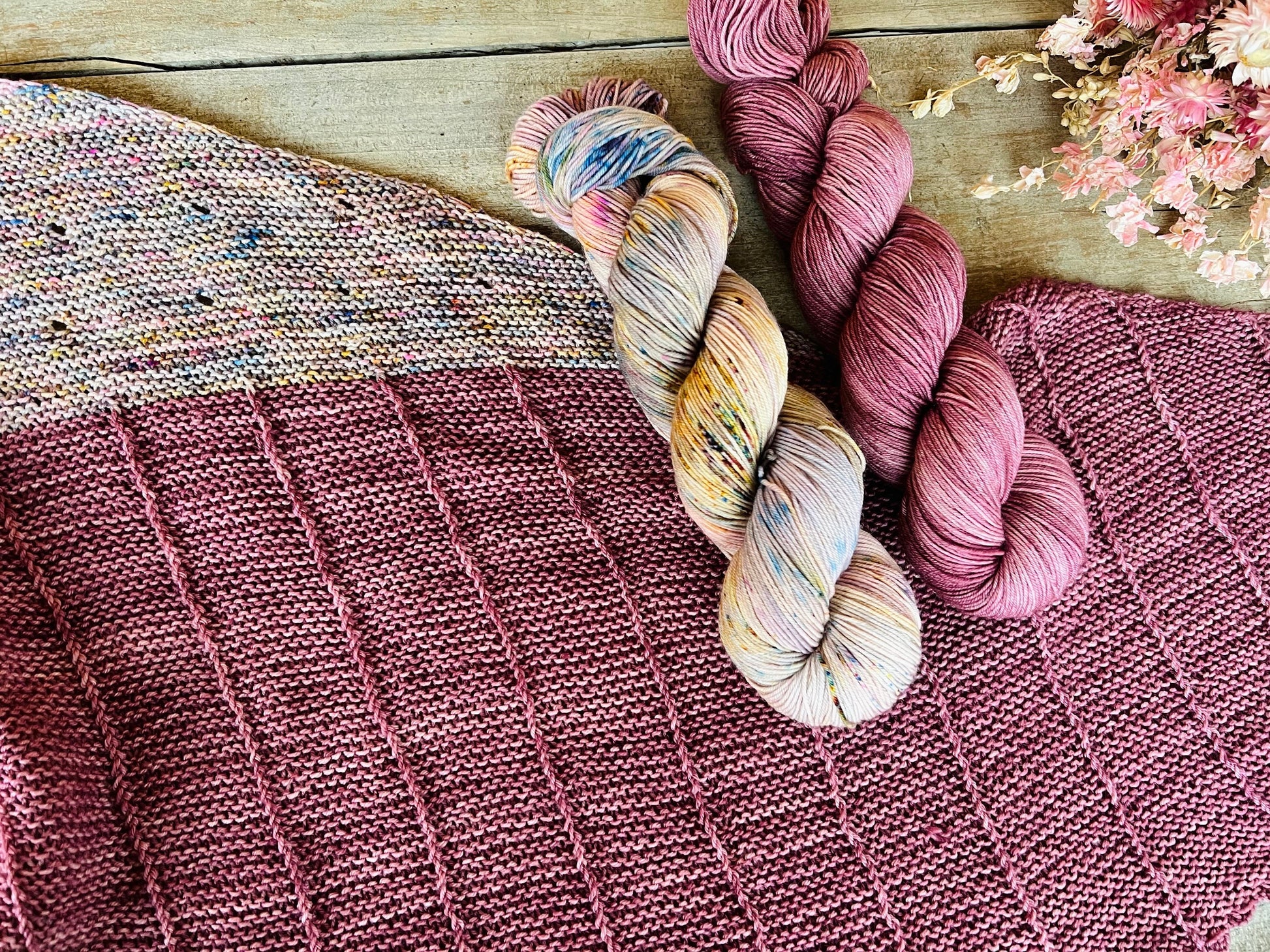 Pour ma version, j'ai opté pour la laine Fingering des Laines d'Ursula, un 100 % Mérinos teint en Violine et Daphné, poids de 100g pour 400m.